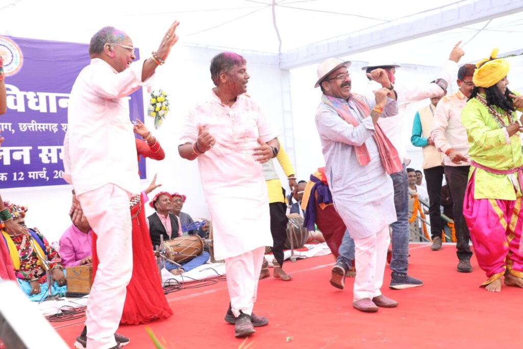 राजस्व मंत्री टंकराम वर्मा ने मुख मुरली बजाए, छोटे से श्याम कन्हैया गीत की मधुर प्रस्तुति दी। विधायक अनुज शर्मा ने का तैं मोला मोहिनी डाल दिये रे और रंग बरसे गीत गाकर समां बांध दिया। विधायक कुंवर सिंह निषाद ने फागुन मस्त महीना और चना के डार राजा गीत गुनगुनाया। विधायक दिलीप लहरिया ने नदिया के पार म, कदली कछार म गीत सुनाकर श्रोताओं को मंत्रमुग्ध कर दिया। विधायक रामकुमार यादव और श्रीमती चातुरी नंद ने भी फाग गीतों से समां बांधा।
