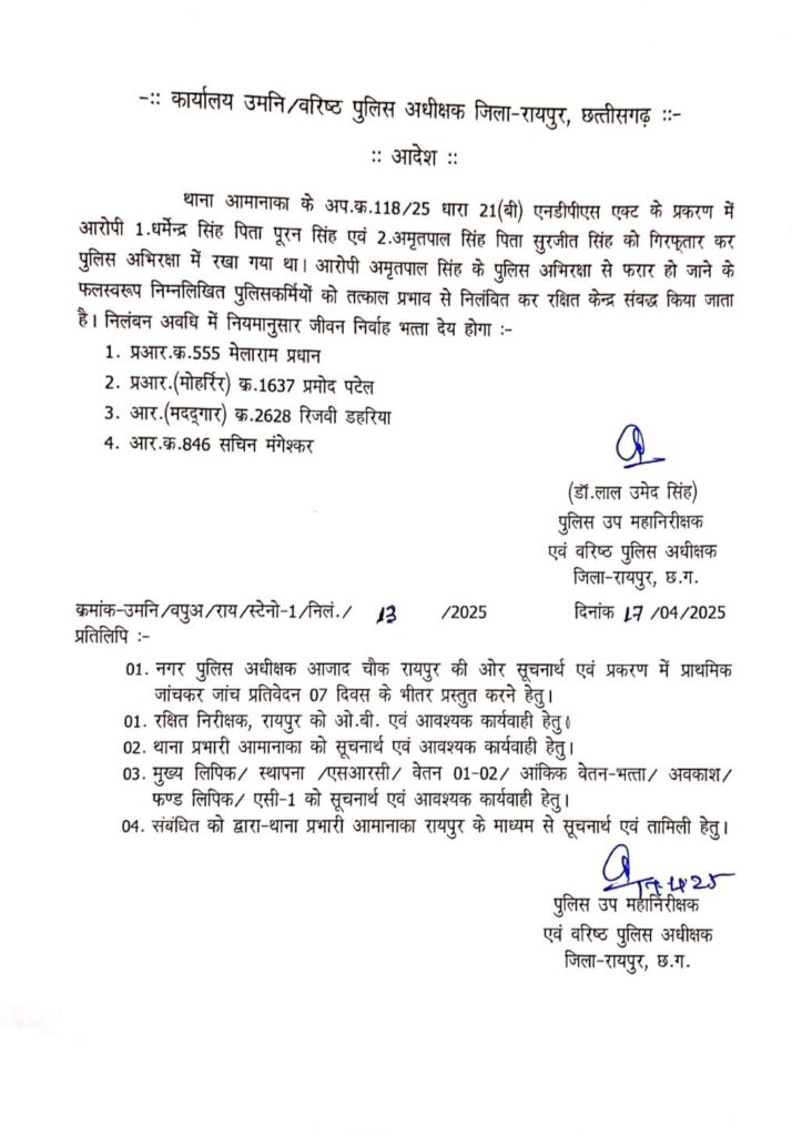 जानकारी के मुताबिक थाना आमानाका के अपराध क्रमांक 118/25 धारा 21 (एनडीपीएस) NDPS एक्ट के तहत गिरफ्तार आरोपियों धर्मेंद्र सिंह पिता पूरन सिंह और अमृतपाल सिंह पिता सुरजीत सिंह को खासी मशक्कत के बाद पुलिस ने चिट्टा समेत गिरफ्तार किया था। दोनों ही आरोपी पुलिस अभिरक्षा में थे, लेकिन रहस्य्मय ढंग से पुलिस की आंख में धूल झोंककर एक आरोपी अमृतपाल सिंहफरार हो गया। तत्संबंध में यह आदेश 17 अप्रेल 2025 को पुलिस महानिरीक्षक IG रायपुर रेंज अमरेश मिश्रा तथा एसएसपी SSP डॉ लाल उमेद सिंह द्वारा जारी किया गया है।