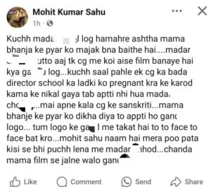 कुछ महीने पहले बड़े प्रोडक्शन हाउस में शामिल ‘एन माही फिल्म’ की छत्तीसगढ़ी फिल्म रिलीज हुई। जब फिल्म नहीं चली, तो निर्माता ने खुलेआम दर्शकों को गालियाँ दीं, धमकियाँ दीं। कुछ पोस्ट डिलीट कर दिए गए, लेकिन कई अभी भी सोशल मीडिया पर मौजूद हैं। मामला महज इतना है कि किसी दर्शक और यूट्यूबर ने सोशल मिडिया में इस प्रोडक्शन की एक फिल्म के बुरी तरह असफलता पर सामान्य टिप्पणी किया था बस फिर क्या था फिल्म निर्माता मोहित साहू ने सोशल मिडिया को ही सड़क छाप गालियों का गुलिस्तां बना डाला था।