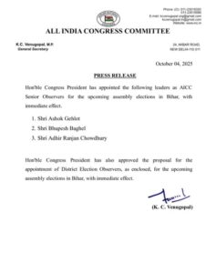 भूपेश बघेल इसके पहले हिमाचल प्रदेश, झारखंड, असम, उत्तर प्रदेश और महाराष्ट्र चुनाव के ऑब्जर्वर रह चुके हैं। 2024 लोकसभा चुनाव में रायबरेली सीट पर जब राहुल गांधी प्रत्याशी थे, तब भी बघेल को ही उस सीट पर ऑब्जर्वर बनाया गया था। फिलहाल, वे कांग्रेस महासचिव के रूप में पंजाब के प्रदेश प्रभारी भी हैं। AICC के महासचिव केसी वेणुगोपाल ने लिस्ट जारी की है। बिहार कांग्रेस ने सोशल मीडिया X पर पोस्ट कर जानकारी दी है।