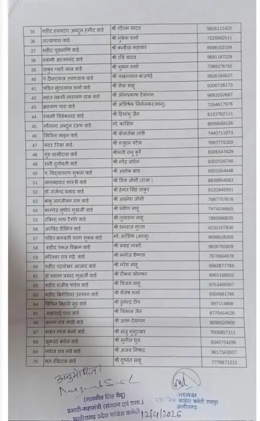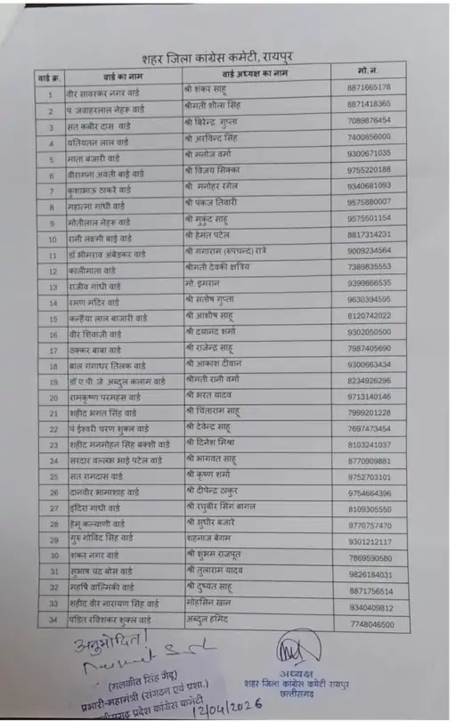शहर सत्ता/रायपुर। (New List of Congress Ward Presidents Released)नई सूची में 19 नामों में बदलाव के बाद संगठन ने संतुलन बनाने की कोशिश की है। आधिकारिक अनुमोदन मिलने के बाद अब इस विवाद पर विराम लगने की संभावना जताई जा रही है। रायपुर वार्ड अध्यक्षों की सूची को लेकर कांग्रेस संगठन के भीतर चल रहे विवाद के बाद नई संशोधित सूची जारी कर दी गई है। इस नई सूची में 19 नामों में बदलाव किया गया है, जिसे अब आधिकारिक मंजूरी भी मिल गई है।