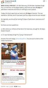 (Israel-Iran War)आंकड़े सामने आने के बाद कांग्रेस ने सरकार से पूछा कि हमारा तेल किसने चुराया? केरल कांग्रेस ने X पर लिखा कि 9 फरवरी को केंद्रीय मंत्री हरदीप सिंह पुरी ने राज्यसभा में बताया था कि हमारे पास 74 दिनों का पेट्रोलियम रिजर्व है और चिंता की कोई बात नहीं है। आज, सरकार कहती है कि हमारे पास सिर्फ 25 दिनों का स्टॉक है। जंग 28 फरवरी को शुरू हुई थी और जंग शुरू हुए सिर्फ चार दिन हुए हैं। तो लॉजिकली, आज से हमारे पास 70 दिनों का पेट्रोलियम रिजर्व होना चाहिए। कांग्रेस ने सवाल किया- हमारे लाखों बैरल तेल रिज़र्व किसने चुराए, जो 45 दिनों के लिए काफी हैं – मोदी के दोस्त? या हरदीप सिंह पुरी पार्लियामेंट में झूठ बोल रहे थे? हरदीप पुरी इसका जवाब दें और इस्तीफा दें।